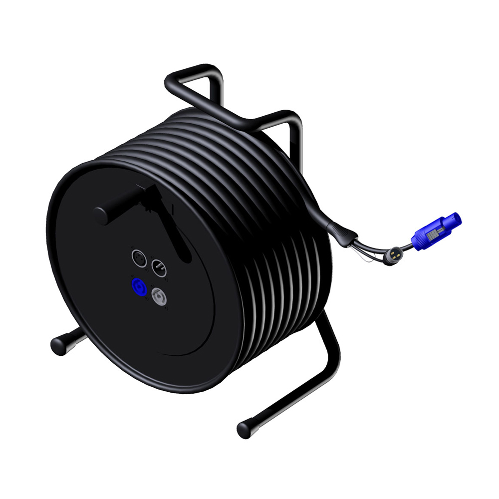 CRX603 ist eine robuste, solide konstruierte Kabeltrommel mit 25 m hochflexiblem Kombi-Kabel (PAC400), bestehend aus einem symmetrischen Mikrofonkabel im Außenmantel plus 3G1-Netzkabel. Das eine Ende des Kabels ist mit einem Neutrik Powercon- und einem Neutrik XLR(m)-Steckverbinder ausgestattet. Die Trommel selbst besitzt jeweils einen Neutrik XLR(m)- und einen Neutrik XLR(f)-Anschluss sowie zwei Powercon-Anschlüsse (In/Out, zum Durchschleifen des Signals).