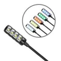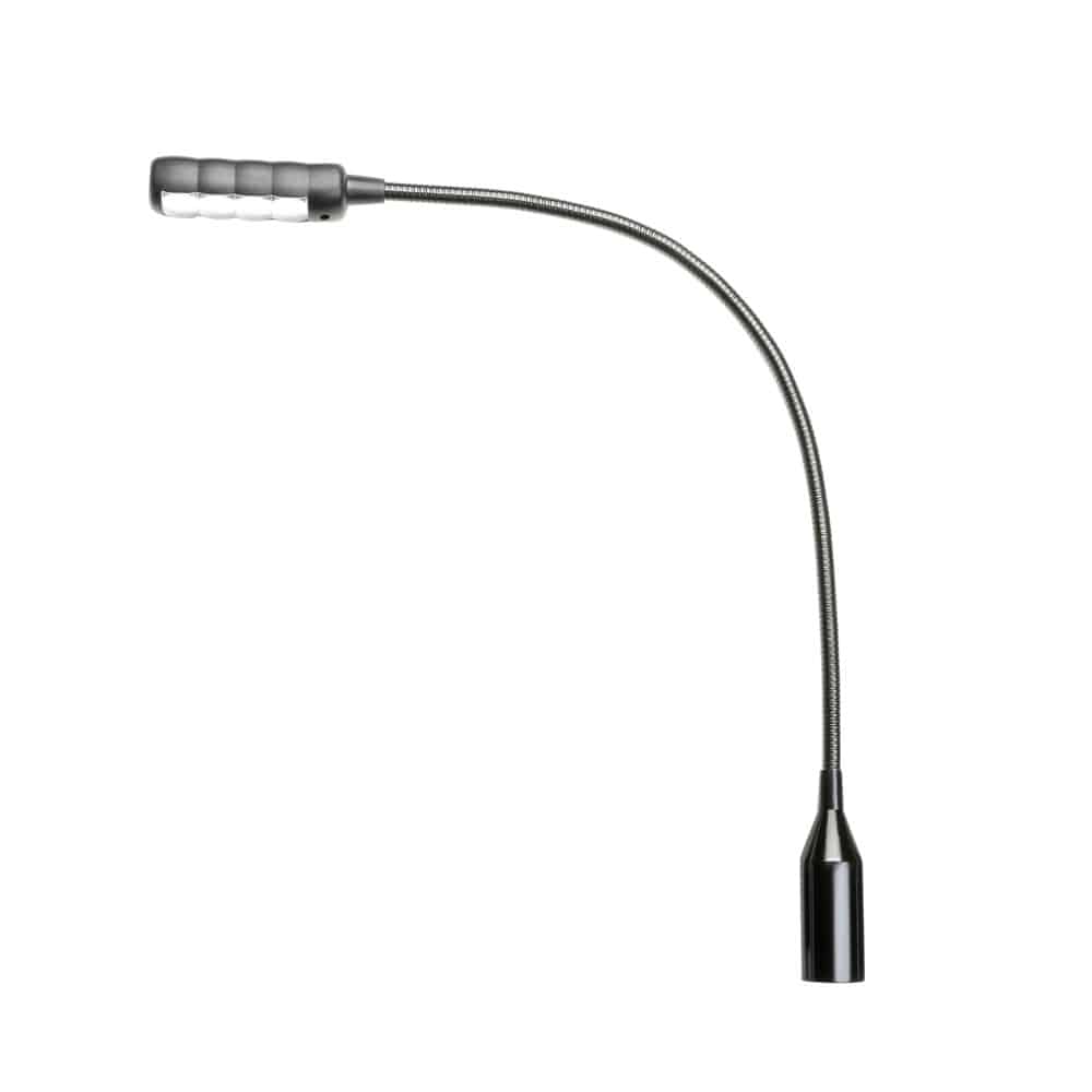 Die SLED 1 ULTRA XLR 3 C ist eine mattschwarze Schwanenhalsleuchte mit 4 besonders hellen COB-LEDs und 4- poligem XLR-Anschluss, die mit 12 Volt oder mit 48 Volt Phantomspeisung betrieben werden kann. Der 30 cm lange Schwanenhals läßt sich flexibel, aber stabil ausrichten, der Ein- und Ausschalter sitzt leicht zugänglich auf dem Lampenkopf