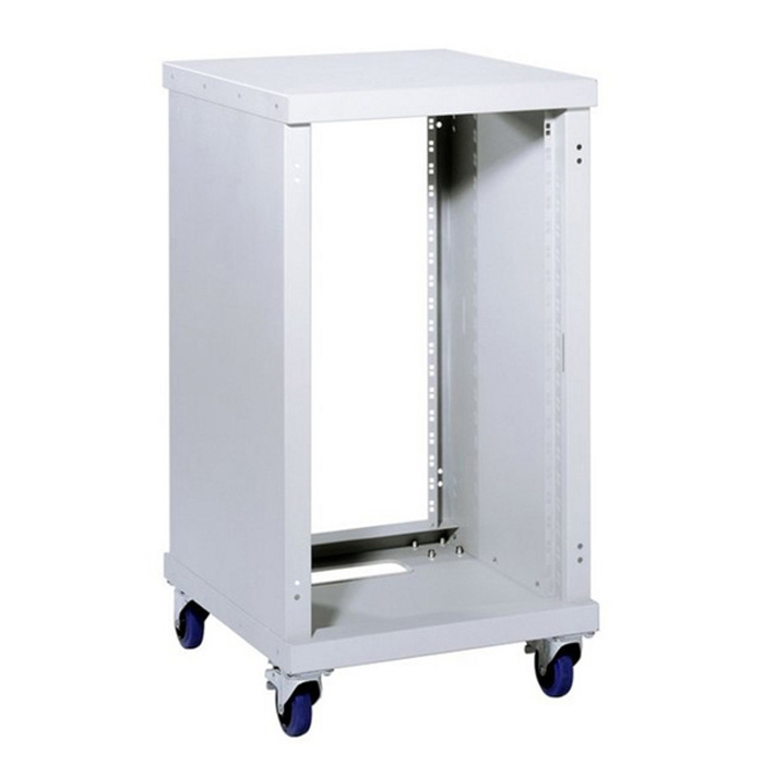 Audio / Video / Lighting / Communication / IT / Laboratory Closed sides with integral 19" panel mounts front and rear available in 10 and 20 units height. Internal installation depth 500 mm. Floor with threaded bushes, to fasten supplied rubber feet or optional castors. Accepts door hinge mounted left or right, on both the front and the back. All parts are zinc plated steel and fine structure powder coated in RAL 7035 grey. Custom colours available on special request.