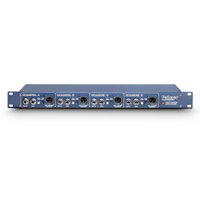 Active 4-channel DI box. Each channel has a jack input with a parallel output for passing through the signal. An attenuation switch (-30 dB) allows either a line or loudspeaker signal to be connected.Active 4 x DI box, 19" format. Technical specitications identicl to the PAN-02, however, the PAN-03 is built for mains operation. All connections and switches are located on the front panel, an additional parallel XLR output is located in back. 19 inch rack-mount format, 1 rack space, 90 mm front to back.