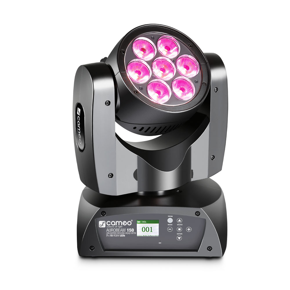 The Cameo AURO® BEAM 150 is an ultra-fast moving head with unlimited pan and tilt movement, 16-bit resolution and a 3,600 Hz refresh rate. Seven 15 Watt Quad LEDs produce rich RGBW colours, fresh pastel colours and vibrant shades of white with a 12° beam angle and a light intensity of 50,000 lux; Single Pixel Control ensures impressive pixel mapping effects.