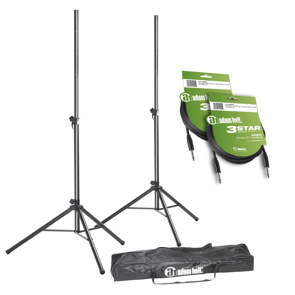 Speaker Stand Set with Transportbag and Speaker Cables - Set composed of 2 x black aluminium speaker stands (SPS023), one transport bag and 2 Speaker Cables 6.3 mm Jack.