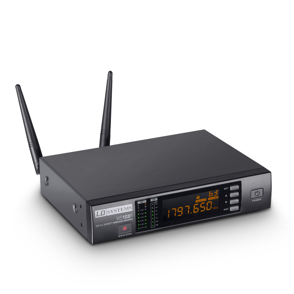 The new LD Systems WS1G8 is a LICENSE-FREE* true diversity wireless microphone system with 192 UHF channels that delivers natural sound with a wide dynamic range, high S/N ratio, and low THD in the 1785 – 1800 MHz band. The WS1G8 series permits simultaneous operation of up to 6 systems and is available in various versions. You can choose between a handheld dynamic or condenser microphone or a belt-pack transmitter with your choice of a headset, a lavaliere microphone, a clamp-on microphone for brass instruments or a guitar adapter cable. The system guarantees reliable audio transmission with a frequency response of 50 Hz to 16 kHz. Both the handheld microphone and the belt-pack have a practical LC display for the channel, the group, and the battery status. The automatic channel scan (ASC) function and the lighted multi-function display on the receiver ensure simple setup and operation. With high quality batteries (AA), it is possible to attain running times of up to 13 hours. All WS1G8 systems come with a rugged transport case made of ABS plastic.