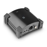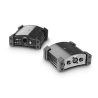 Caja de inyección directa activa en una robusta carcasa metálica (aluminio/acero) y protectores de esquina, de color azul metalizado. Funciona con batería interna de 9 V (el indicador parpadea cuando está operativa) que se desactiva automáticamente