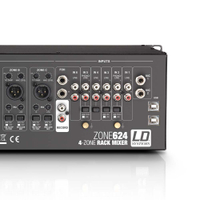 I due ingressi microfono simmetrici dispongono di una regolazione comune del suono a tre bande, di alimentazione phantom 12 V e di una funzione Talkover la cui attenuazione può essere regolata individualmente sul lato posteriore per tutte le uscite di zona. I sei canali d'ingresso stereo di ZONE 624 sono dotati di controlli del guadagno, LED del segnale e dei valori di picco, fader da 45 mm, tasti Cue e prese RCA (Cinch) il canale 6 è inoltre dotato di ingressi Jack bilanciati per il segnale FOH. L'apparecchio dispone anche di un ingresso AUX commutabile tramite mini-jack da 3,5 mm e di un collegamento USB che funge da ingresso e uscita stereo (Recording Out) e trasforma ZONE 624 in un'interfaccia audio esterna.