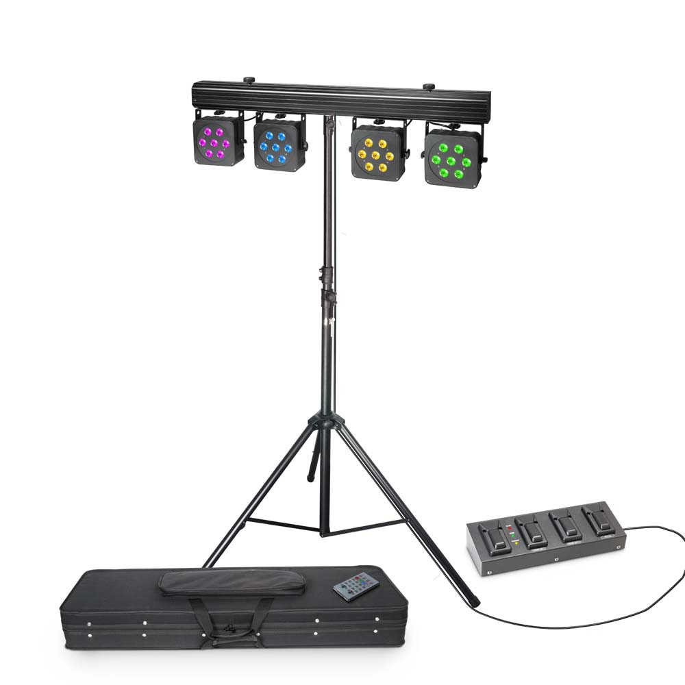 Set di proiettori a 28 LED a quattro colori da 8 W con valigetta di trasporto, pedaliera a 4 pedali e treppiede