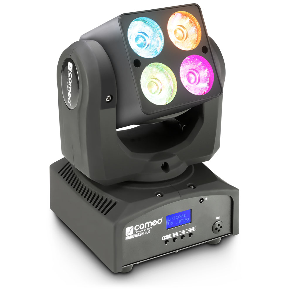 Cameo NanoWash 400 è un mini proiettore Wash a testa mobile con movimento pan infinito e tilt da 180°; i LED RGBW Cree a lunga durata da 10 W generano intensi colori di base, precise tonalità pastello e livelli di bianco naturale. Effetti potenti particolarmente impressionanti grazie alla modalità Single Pixel e alla modalità di inversione commutabile, che muove il proiettore a testa mobile nella direzione opposta quando due sistemi funzionano in tandem.