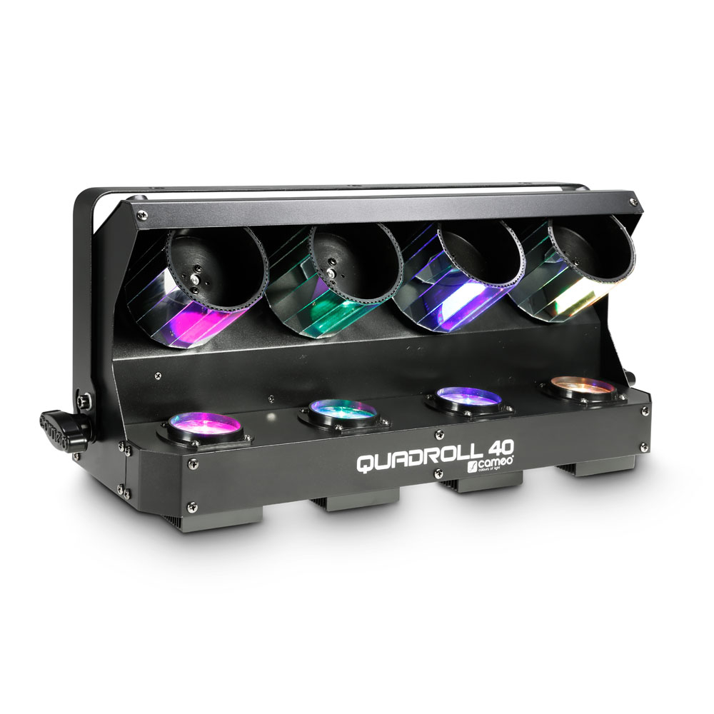 Cameo QuadRoll 40 ha quattro scanner rotanti a specchio e potenti Quad-LED Cree da 10 W, per straordinari effetti di movimento della luce. Gli scanner sono azionati da potenti motori passo-passo, mentre raggi di luce RGBW saturi e precisi ruotano con un angolo di proiezione di 4,5°.