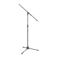 This microphone boom stand is made of hardwearing steel tubing with black powder coating finish. It features a durable tripod base with locking leg that eliminates the need for a set screw. Folding the locking leg halfway allows you to slide the leg collar up and down the shaft, folding it to the upper or lower stop locks the collar in place for quick setup or compact transport.