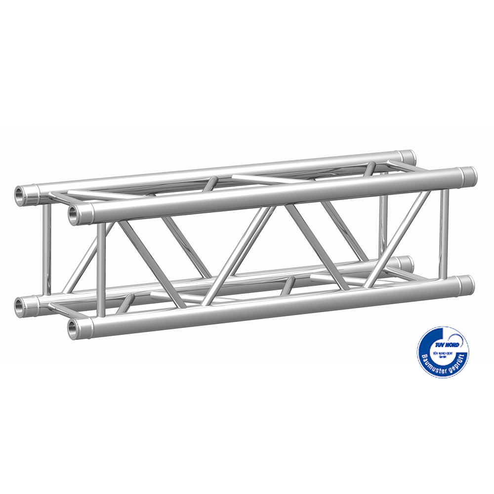 The construction with 50x2mm main tubes and 20x2mm struts is designed for extreme load bearing capacity and, with its 290mm exterior dimensions, corresponds with the professional standard. The high-bending-strength aluminium alloy 6082A T6 and state- of-the-art welding technology ensure an extremely rigid structure that is especially suitable for large lengths: an 8m QUADRO 290A truss has a load bearing capacity of 511kg. Continuous stringent inspections during and after production ensure reliable safety. Of course the QUADRO 290A-System is TÜV tested and complies with DIN/ISO standard 4113.