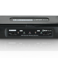 Operating in the 863.9 and 864.9 MHz bands, this ECO 2 Series set includes two handheld dynamic microphones with cardioid polar pattern and a 2-channel diversity receiver featuring balanced XLR outputs, an unbalanced 1/4” mix output plus level and squelch controls and LED status indicators for each channel.