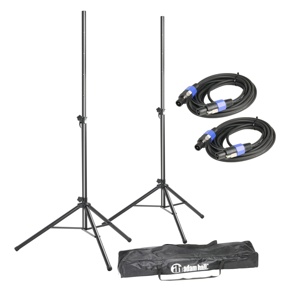 Zestaw stojaków głośnikowych z torbą i kablami głośnikowymi – składa się z 2 aluminiowych stojaków głośnikowych (SPS023), torby transportowej i 2 szt. kabli głośnikowych.